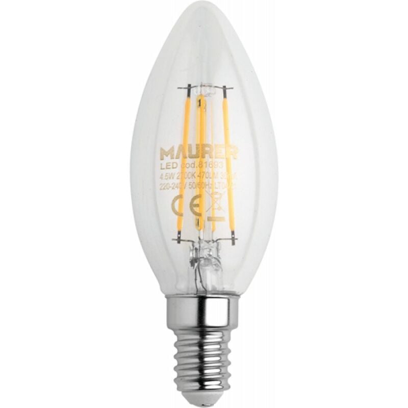 LAMPADA LED FILAMENTO MAURER OLIVA E14 4,5W 470ML 2700K L.CALDA Attac.-Potenza: E14-4,5 Watt Luce: 2700°K Calda Sviluppo: 470lumen Con filamento - Apertura fascio luminoso 360° - Rispamio energetico Classe F - Conf. in blister
