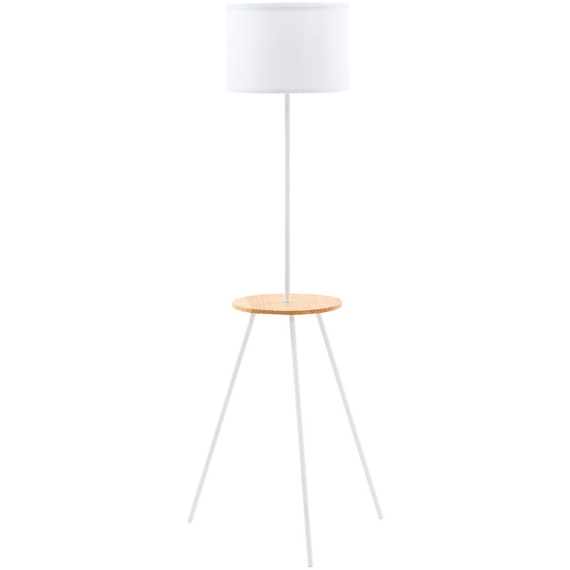 Lampada da terra dal design scandinavo, tre sottili aste, in metallo verniciato bianco, sorreggono un tavolino in legno, dal quale si dirama il corpo della lampada sormontato da un paralume in tessuto bianco che consente una perfetta diffusione della luce. Lampada versatile e d'arredo è ideale per ambienti come salotti, open space o living.
