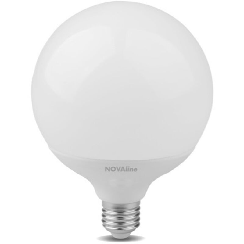 Lampadina Led Globo 24W E27, Luce naturale 4000K, Marca: NOVA LINE. Realizzata in plastica e alluminio, ideale per uso interno. Dimensioni: 176x125 mm. Caratteristiche elettriche: tensione nominale 220-240V, corrente 209 mA, fattore di potenza >0,5, potenza 24W, frequenza 50/60 Hz. Caratteristiche illuminotecniche: 2452 lumen, temperatura colore 4000K, resa cromatica >80, diffusione 270°, classe energetica F, durata 20000 ore, 10000 accensioni. Non dimmerabile, equivalenza incandescenza 150W, ac