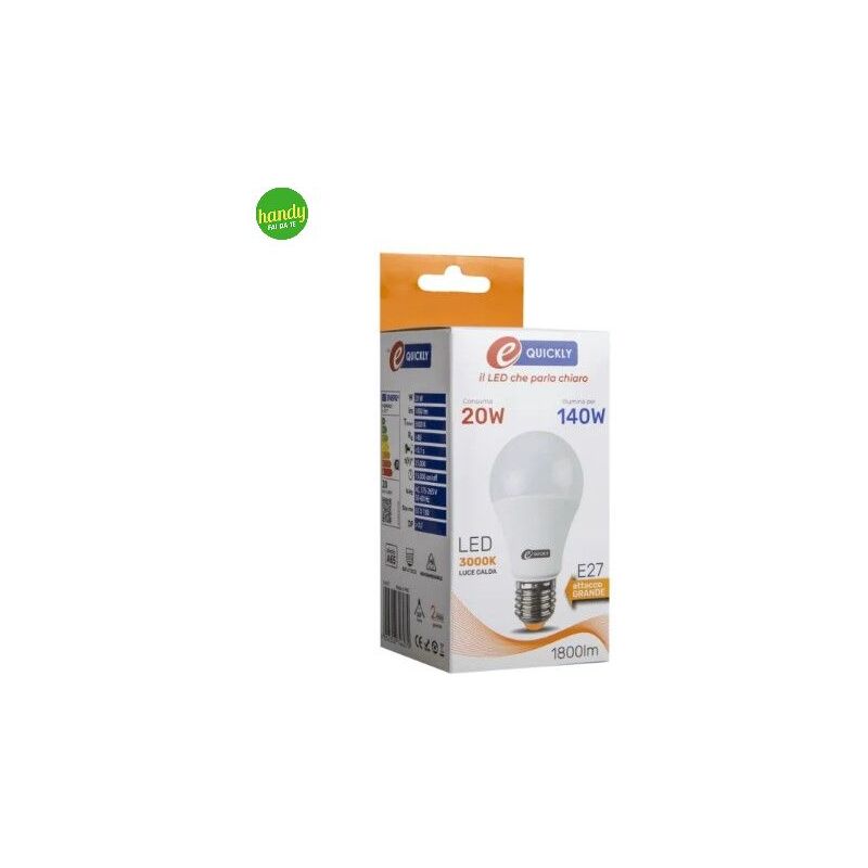 Lampadina Led prodotto dal brand E-Quickly. Lampadina con attacco E27, conpotenza di 20W può generare 1800 lumen, luce bianca calda perfetta 3000K, l'efficienza della luce è uniforme e omogenea. La lampadina corrisponde ad una lampadina a incandescenza convenzionale da 140 W.La confezione contieneuna lampadina.