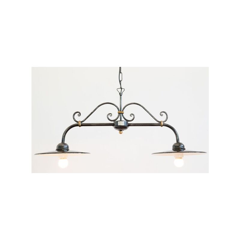 LAMPADA LAMPADARIO A BILANCERE 2 PIATTI SMALTATI PICCOLI CRUCCOLINI LANTERNE LAMPADA PLAFONIERA Lampadario dal design ispirato all'illuminazione degli anni '50, quando l'energia elettrica raggiungeva le case degli italiani. Elemento caratterizzante era il disco in lamiera che proteggeva la lampadina dalle intemperie. I nostri designer hanno reso attuale questo cult dell'illuminazione riadattandolo ai canoni moderni. La struttura è in ferro nero con patinature argento, impreziosita da riccioli forgiati a mano tenuti insieme da fascette dorate. I piatti in ferro sono smaltati a caldo, processo che ne rende la superficie lucida e brillante proprio come negli anni '50, ed intensifica la luce riflessa. Il lampadario Piatto è regolabile in altezza adattandosi a tutte le esigenze. Da abbinare agli altri complementi della collezione. Dimensioni: 85 ↔ x 27 ↗ x 38 ↑ cm Paralume: Piatti smaltati Ø cm 27 Massima estensione: 100 ↑cm Lunghezza catena: 60 ↑ cm Consiglio d'uso: Lampadario consigliato