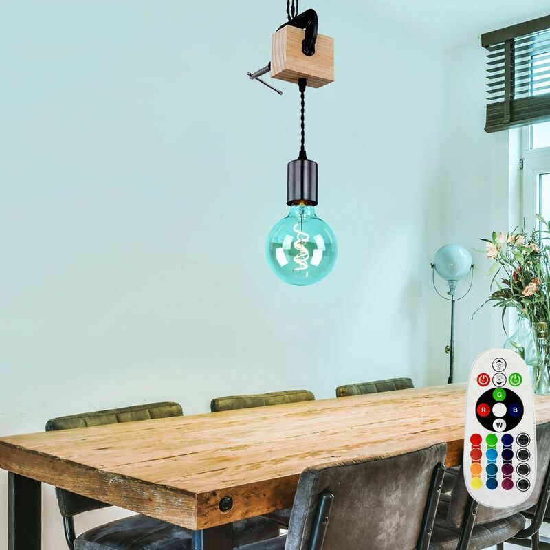 Descrizione Un colpo d'occhio garantito! Questa lampada a sospensione colpisce per il suo design elegante e moderno. La lampada ha una lunghezza totale di 120 cm ed è dotata di attacco E27. L'illuminante non è compreso nella fornitura. Ciò ti consente di selezionare la lampada adatta a te (max. 60 W) e di determinare tu stesso il colore della luce e l'intensità della luce. Grazie alla presa E27 esistente, sei libero di scegliere l'illuminante e quindi la scelta del colore e dell'intensità della luce. È inclusa una lampadina LED RGB di alta qualità a risparmio energetico con telecomando! Particolare lampada • Tipo di lampada: lampada a sospensione • Materiale: metallo, legno • Colore: nero, colore naturale • Grado di protezione: IP20 • Altezza x lunghezza x larghezza in cm: 120x14x10 • Presa: 1x E27 • Lampadina inclusa: Sì • Potenza lampada: 1x 9 watt • Voltaggio: 220V, 50Hz Particolare lampada • Tipo di sorgente luminosa: RGB-LED • Presa: E27 • Materiale: metallo argento, plastica