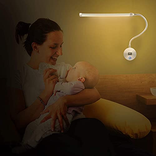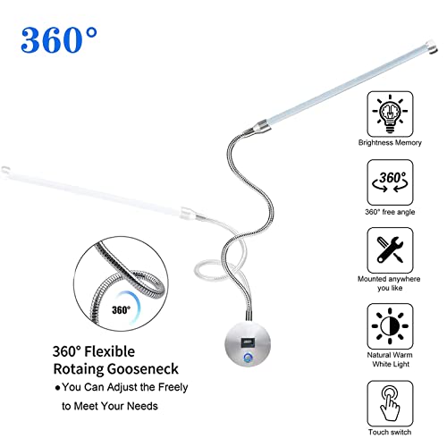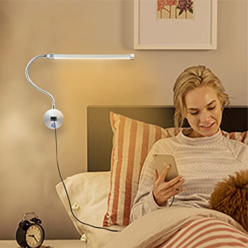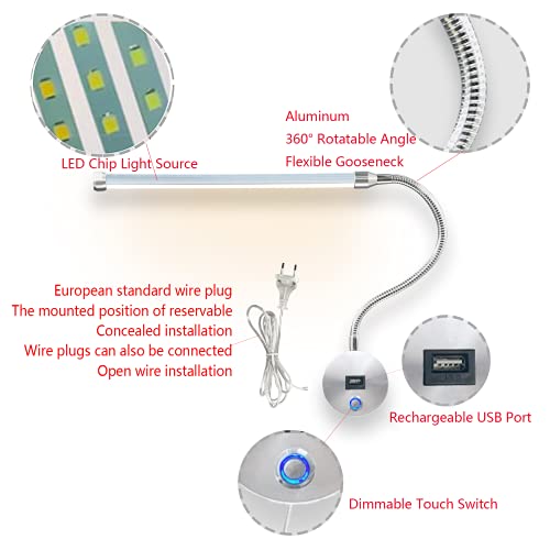 Lampada da Lettura LED Dimmerabile con Interruttore Touch e Porta USB, Lampada a Collo di Cigno Flessibile 360° Regolabile Lampada da Parete Interno Illuminazione da Parete con Cavo e Spina EU, 6W