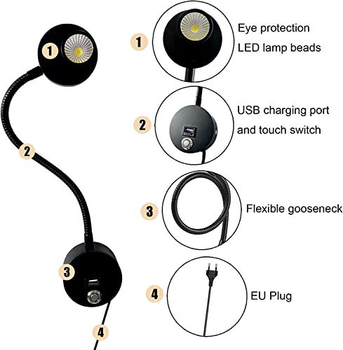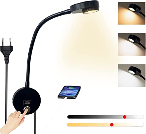 Lampada da Lettura da Parete LED Touch Dimmerabile con Porta di Ricarica USB, 3 Modalità di Illuminazione, Oscuramento Continuo, 3W Lampada a Collo d'oca Flessibile Faretto da Lettura con Interruttore