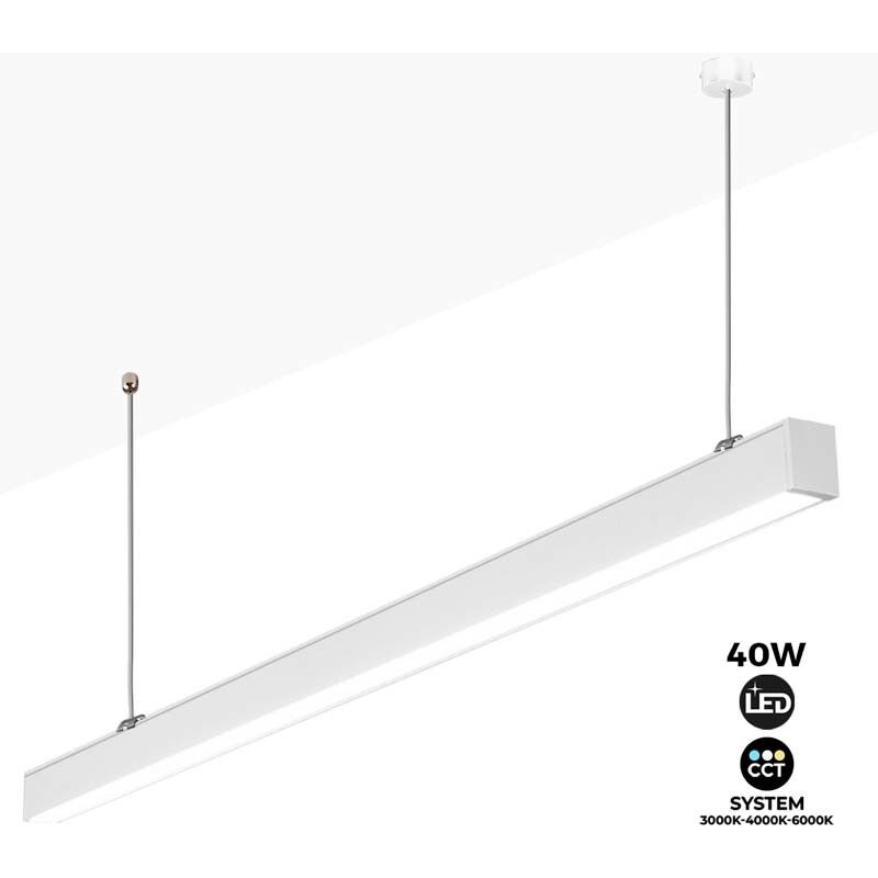 Apparecchio lineare a LED dal design moderno per installazione a sospensione o a plafone. Con una potenza di 40W, offre un'illuminazione con un elevato indice di resa cromatica(CRI>80) e senza sfarfallio. Il sistema CCT consente di regolare la temperatura di colore tra bianco caldo, neutro e freddo (3000K, 4000K e 6000K). Include un kit di installazione completo per il montaggio a sospensione e a soffitto. Disponibile nei colori bianco, nero e grigio.