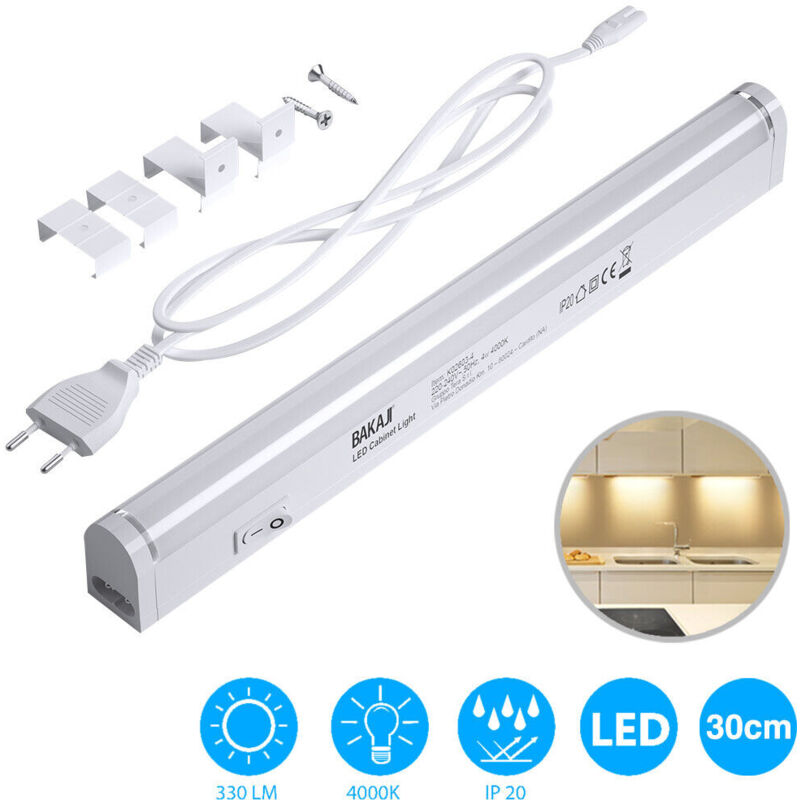 Illumina gli interni di armadi, mobili o sottopensili da cucina con la nuovissima barra LED sottopensile ad alta luminosità di Bakaji.La superficie di illuminazione di questa barra LED da 30 cm, vanta di ben 330 lumen di pura potenza illuminante garantiti da un chip LED che produce una luce Bianco naturale ad alta luminosità, con un consumo di soli 4W.Realizzato interamente in plastica di altissima qualità con diffusore in policarbonato, design ultraslim e salvaspazio facile da installare grazie al kit di montaggio incluso nella confezione che ne permette una facile installazione sotto qualsiasi tipo di mobile, armadio o muro, inoltre ogni barra è prolungabile tramite l'apposita prolunga inclusa che permette di collegare fino a 10 barre luminose tra di loro.La barra sotto pensile di bakaji è il sistema di illuminazione perfetto per illuminare tutte quelle aree con scarsa luminosità come interni di armadi, cabine armadio, sottopensili da cucina, parete attrezzate, librerie, aree di