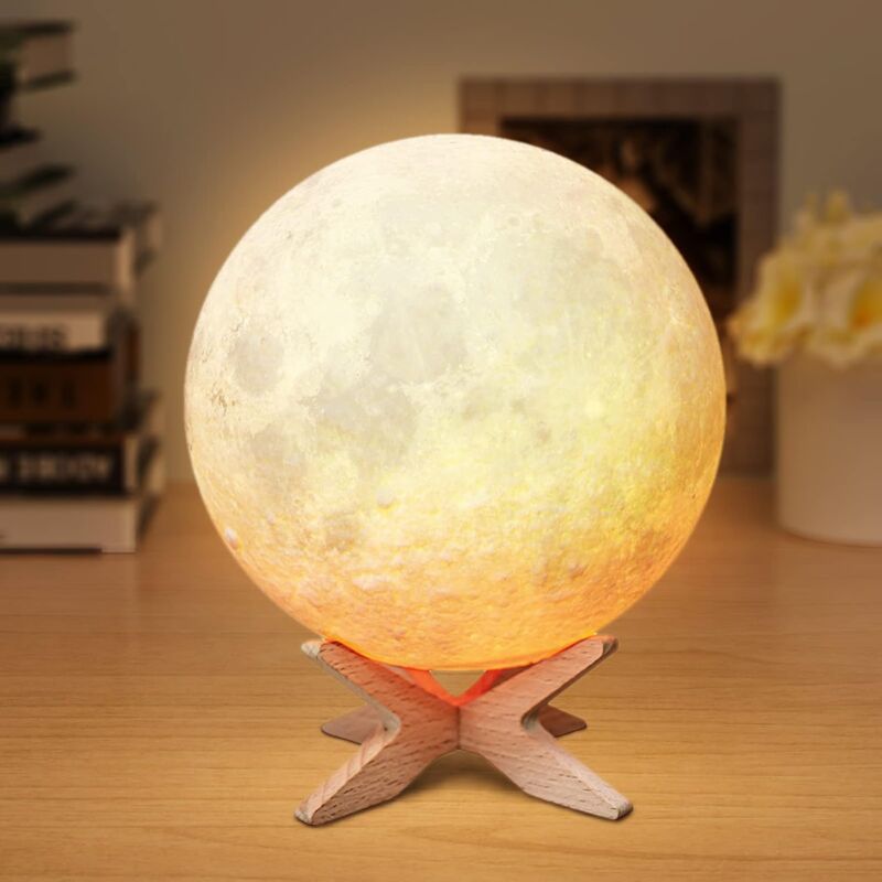 è inoltre fornita con un caricatore USB . Insieme con il lamp you get an abstract wooden stand on the moon lamp can sit wodurch sie sich ideal für die Platzierung in jedem Bereich Ihres Hauses eignet . Die Mondlampe besteht aus von der FDA zugelassenem PLA und ;