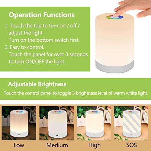 【Dimmerabile e Cambio Colore RGB】 Ci sono 3 livelli di luminosità bianco caldo (lieve, moderata ed evidenziare) e SOS modalità lampeggiante. Si può facilmente cambiare la modalità di colore semplicemente toccare la parte superiore di questa lampada a LED e il colore fisso che ti piace (rosso, verde, blu, arancione, azzurro, rosa).