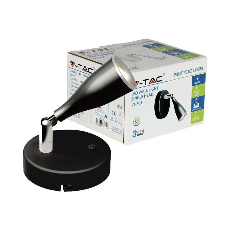 Lampada da parete a LED 4.5W 4000K nera con interruttore SKU: 8678: VT: VT-805 Caratteristiche del prodotto Lampade da parete LED sono disponibili nei colori: nero, bianco Facili da montare La tensione di alimentazione richiesta: 110/240 Volt Installazione Adatte a molteplici impieghi: illuminazione residenziale, alberghi, ristoranti, uffici, ovunque sia necessario limpiego di lampade a sospensione. Specifiche tecniche Informazione generale Vitamedia 30000 ore Dati elettrici Potenza 4.5W Tensione AC 220-240V Frequenza 50/60Hz Fattore di potenza 50/60Hz Dati tecnici luce Fascio Luminoso° 100° Colore della luce Bianco naturale Temperatura di colore 4000K Flusso luminoso (lm) 360 lm Indice di resa cromatica Ra >80 Dettagli corpo Colore Nero Materiale Plastica, Metallo Funzionalità IP Protezione IP20 Dimmerabile No Tempo innesco 100% 0.001 secondo Stabilità del colore Intensità luminosa, Cd 160.39 Cd Max. Numero cicli accensione / spegnimento 15000 Condizioni di lavoro Non adatto per
