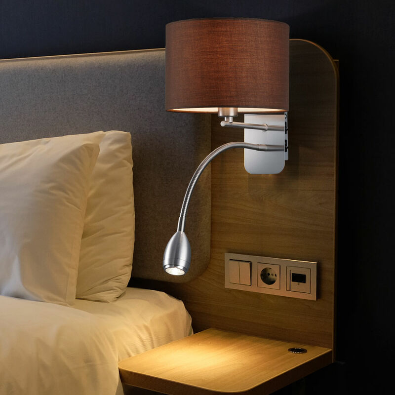 Descrizione Elegante lampada da parete con braccio girevole flessibile per un uso confortevole. La staffa della lampada da parete e il braccio di lettura sono in argento. Combinata con un paralume in tessuto marrone, la lampada ha un aspetto sottile e senza tempo. Entrambe le sorgenti luminose possono essere accese separatamente e possono soddisfare esigenze diverse. Il braccio di lettura flessibile consente un orientamento mirato della luce e può essere regolato in base alle proprie esigenze. Idealmente, la lampada trova posto nella camera da letto accanto al letto, perché la lampada è ideale come lampada da lettura e da comodino grazie alla combinazione della piacevole luce del paralume in tessuto e del braccio flessibile orientabile. Una lampadina a LED è già installata nel braccio orientabile della lampada! Particolare lampada • Tipo di apparecchio: lampada da parete • Materiale: metallo, tessuto • Colore: marrone, argento • regolabile • commutabile separatamente • Grado di