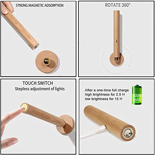 Lampada da Parete a LED dimmerabile in Legno con Interruttore Touch Control, Applique da Parete Magnetica Staccabile 360° Applique da Parete Girevole per Camera da Letto Comodino Lettura vanità, Luce