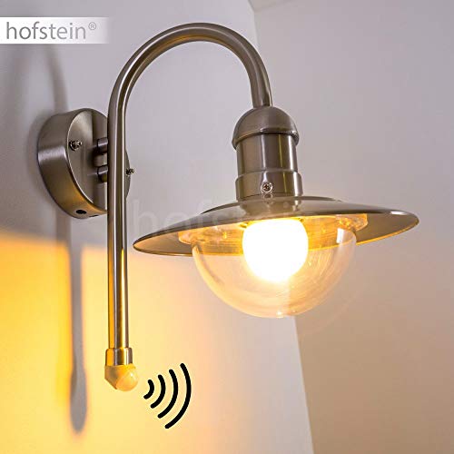 Lampada da parete per esterni Elima, rilevatore di movimento, angolo di rilevamento 100°e raggio d'azione 1-8 metri, acciaio inox, E27, spot per terrazza/giardino/porta di casa, IP44, senza lampadina