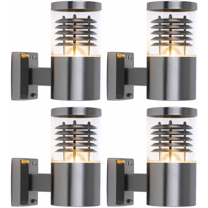 Descrizione Lampade da esterno moderne in acciaio inox per il tuo giardino. Queste lampade da parete fanno risplendere la tua area esterna con una luce uniforme e illuminano in modo ottimale il luogo di utilizzo prescelto. Che sia sul balcone, sulla terrazza o come illuminazione d'ingresso, fa bella figura ovunque. Certificato secondo la classe di protezione IP44, è predestinato per l'uso esterno. La lampadina non è inclusa nella fornitura. La fornitura comprende 4 applique! Particolare lampada • Tipo di lampada: lampada da parete • Materiale: acciaio inossidabile, plastica trasparente • Grado di protezione: IP44 • Larghezza x altezza x profondità in cm: 10 x 21 x 15 • Peso: 0,875 kg • Presa: 1x E27 • Lampadina inclusa: n • Potenza della lampada: 1x massimo 15 watt • Alimentazione: 220-240V, 50-60Hz