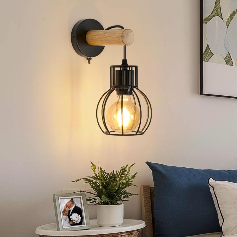 Applique industriale - - Il braccio della lampada da parete è realizzato in legno massello naturale attorcigliato da un filo spesso che sospende un paralume a gabbia in metallo con finitura nera. La combinazione di materiale in legno massello e metallo nero è un abbinamento classico, crea un design industrial-chic che aggiunge carattere e fascino allo spazio interno. [Comodo interruttore a bilanciere] - L'interruttore a bilanciere integrato aggiunge praticità, consentendo di accendere e spegnere facilmente l'applique senza la necessità di un interruttore a parete separato. Nel frattempo, può essere utilizzata anche come lampada da lettura sul comodino. [Dimensioni fantastiche] - Altezza corpo lampada: 28,5 cm;