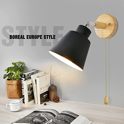 Lampada Da Parete Con Interruttore A Fune Rotazione Libera Di 350° Lampada Da Comodino Macaron Vintage Moderna E27 Lampada Da Parete In Legno Adatto Per Soggiorno E Camera Da Letto(Nero)