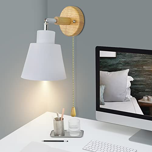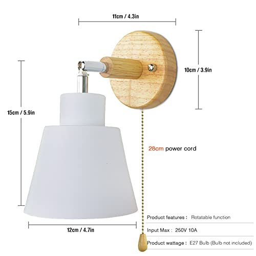 Lampada Da Parete Con Interruttore A Fune Rotazione Libera Di 350° Lampada Da Comodino Macaron Vintage Moderna E27 Lampada Da Parete In Legno Adatto Per Soggiorno E Camera Da Letto(Bianco)