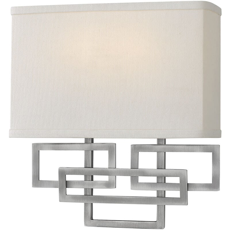 Collezione Lanza ROBUSTO ED ELEGANTE Lampada da parete a 2 luci - Nichel Antico. Lanza si impone con eleganza grazie alla sua robusta lavorazione rettangolare del metallo. I dettagli geometrici sono ammorbiditi da paralumi in lino e lenti acriliche per un fascino sofisticato e moderno. Lanza è disponibile in nichel antico, bronzo spazzolato e bronzo strofinato a olio.