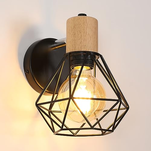 Lampada da Parete Vintage, Nero E27 Applique da Parete Interno in Metallo e Legno, Lampada a Muro Retrò per Soggiorno, Cucina, Sala da Pranzo e Camera da Letto (Lampadina non inclusa)