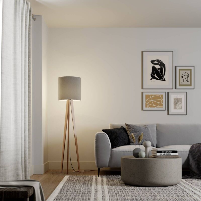 Lampada da pavimento in tessuto Nida con paralume grigio a forma cilindrica e struttura in legno naturale, un prodotto esclusivo di qualità made in Germany. Con la struttura a treppiede in legno e il paralume grigio a forma cilindrica, Nida esprime eleganza e modernità. Il paralume in feltro trattiene gran parte della luce, che si diffonde nell'ambiente principalmente dalle aperture in alto e in basso. Questa lampada da pavimento illumina l'ambiente con una luce calda che crea un'atmosfera invitante e accogliente. Una luce d'accento perfetta per qualche ora di relax in soggiorno. Il cavo di alimentazione della lampada è nero e l'interruttore di accensione è montato sul portalampada. Per la massima sicurezza, la superficie in feltro è rivestita con una pellicola B1 di materiale difficilmente infiammabile. La struttura a treppiede in legno naturale è in linea con le tendenze del momento e si ispira allo stile scandinavo, noto per i suoi elementi caldi e naturali. Nida è un prodotto di