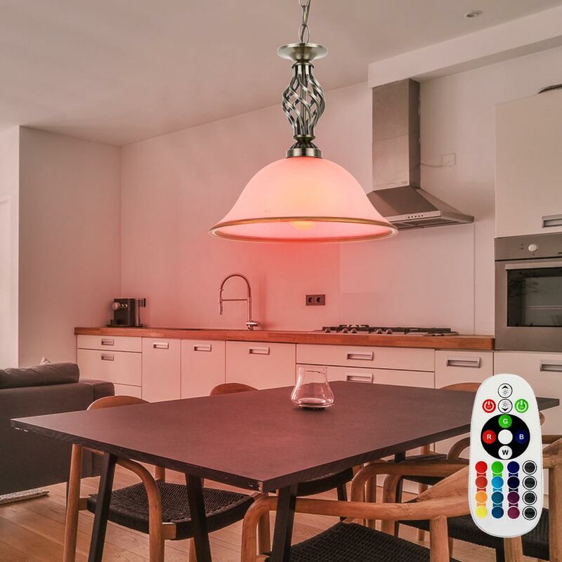 Descrizione Lampada a sospensione in stile antico per il tuo salotto. Questa lampada colpisce per il suo design. Realizzato in ottone antico e vetro satinato con bordo verniciato, attira davvero l'attenzione e valorizza visivamente lo spazio abitativo scelto. Questa lampada a sospensione fa una bella figura sopra il tavolo del soggiorno o della sala da pranzo. Utilizzando il telecomando incluso, la lampadina LED RGB può essere regolata su diversi colori, fornendo così un'illuminazione suggestiva. Nella fornitura sono inclusi una lampada LED RGB e un telecomando per la luce bianca e il controllo RGB. Lampada dettagli • Tipo di lampada: lampada a sospensione • Materiale: ottone vecchio • Paralume: vetro satinato, bordo verniciato in ottone vecchio • Diametro x altezza in cm: 30x120 • Attacco: 1x E27 • Lampadine incluse: sì • Potenza lampada: 1x 9 watt • Flusso luminoso: 1x 806 lumen • Colore della luce: bianco caldo • Telecomando: solo per la lampadina LED RGB • Alimentazione: 220-240V