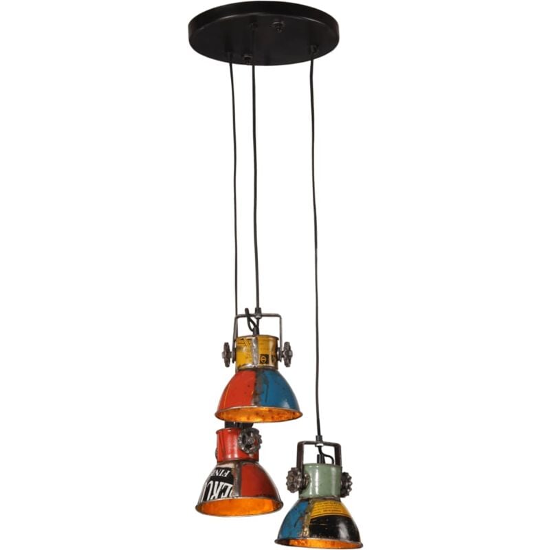 Questa lampada pensile mette decisamente in risalto il soggiorno, la sala da pranzo, l'ufficio, e così via. Materiale resistente: Il ferro è un materiale duro e resistente. È uno dei prodotti preferiti per la costruzione nel campo dei mobili e in quello industriale. Colore dipinto a mano: Siccome ogni pezzo è realizzato a mano, i colori unici variano a seconda di ciascun prodotto. Design con 3 paralumi: La lampada, con 3 paralumi, è dotata di tre prese E27 per lampadine con un massimo di 25 watt. Potete scegliere e installare lampadine E27 dai vari colori di luce, creando un'atmosfera di relax e riposo. Stile industriale: Il paralume in ferro, caratterizzato da una finitura di colori misti di recupero, si adatta perfettamente agli interni rurali o industriali. Buono a sapersi: Si tratta di una lampada in stile industriale con imperfezioni sul paralume, che dona identità alla lampada e la rende unica grazie al suo aspetto grezzo. Le lampadine non sono incluse. Colore: Multicolore