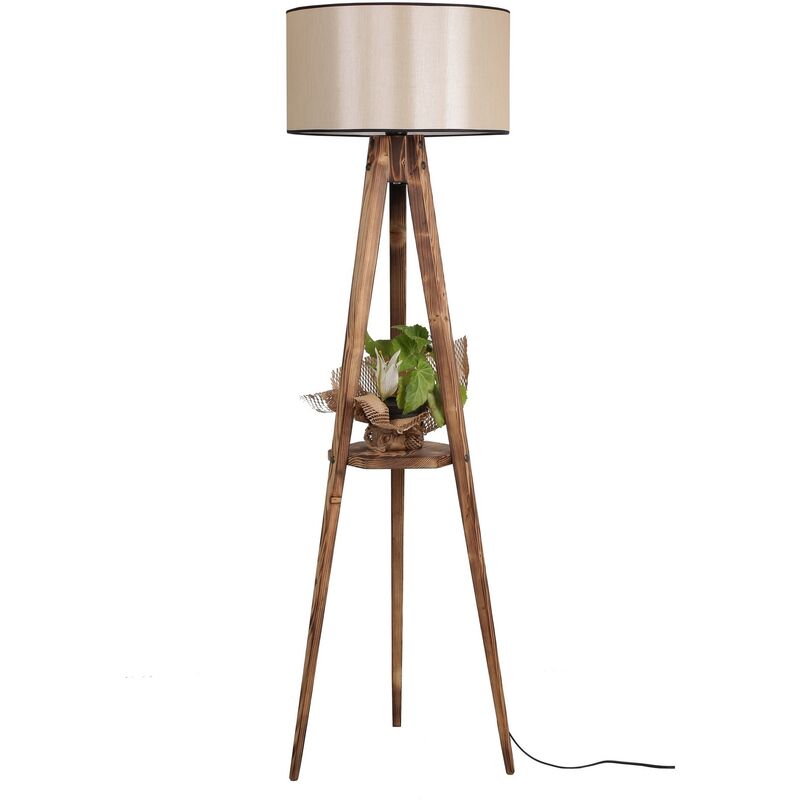 Lampada da pavimento colore marrone Struttura in legno Schermo in tessuto Scaffale in legno Altezza dello schermo: 24 cm Schermata del diametro: 45 cm Diametro del piede: 50 cm Altezza totale: 153 cm Scaffale: 26 x 26 cm Altezza: 65 cm Interruttore di onda/spegnimento nel cavo Vernice secca al forno elettrostatico Tipo di discussione: E 27 Max 60 W Tensione massima: 220-240 V.