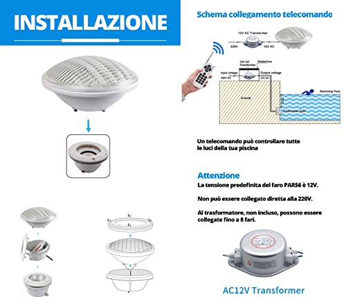 Lampada Led Piscina 12V RGB MULTICOLOR PAR 56 - Impermeabile IP68 24 Watt - 2400 Lumen Classe A++ - Telecomando incluso - Luci Illuminazione LED Stagni Laghetti (1x RGB)