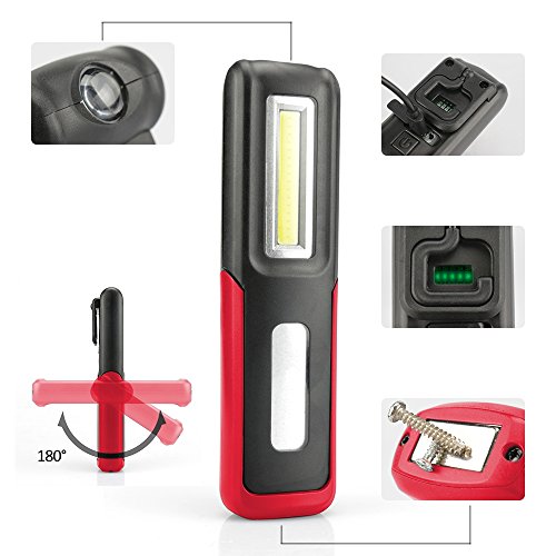 Lampada LED Portatile, Magnetica Ricaricabile COB Tramite USB, Supporto Regolabile e Gancio Girevole, Torcia d'ispezione per Auto e Camion, Uso Officina, Campeggio, Lampada d'Emergenza (Nero+Rosso)