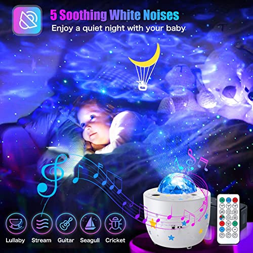 Telecomando e musica delicata integrata: l'ultimo proiettore di luce notturna con telecomando può accendere e spegnere liberamente la lampada, cambiare la modalità di illuminazione, regolare la velocità del motore e la luminosità della luce o spegnere automaticamente il timer, luce notturna galassia per bambini, timer integrato 2H, 4H, 6H, timer auto off. Accompagnato da 5 canzoni meravigliose, i bambini amano ascoltare suoni diversi, la musica può allenare l'udito del bambino.