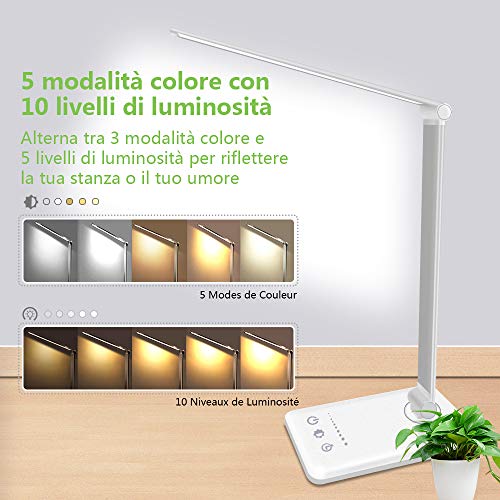 Lampada da Scrivania, AUELEK Lampada da Tavolo LED con USB di Ricarica per Smartphone 5 Temperature di Colore & 10 Livelli di Luminosità Touch Control, Funzione di Memoria