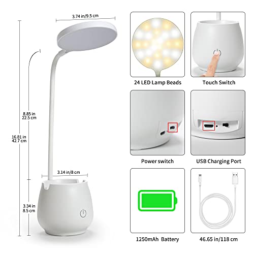 Lampada da scrivania a LED, 3 colori e senza livelli continui, dimmerabile, con ricarica USB, per bambini, interruttore touch per studio, lavoro, lettura (portapenne/supporto telefonico)