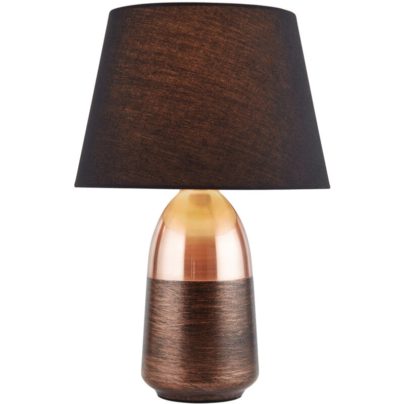 Collezione Tocco TOUCH La lampada da tavolo Touch - Rame spazzolato e rame graffiato trasuda eleganza. Con il suo sontuoso accento di rame spazzolato e graffiato sulla base e l'elegante paralume nero, fonde armoniosamente l'estetica tradizionale e contemporanea. Questa luce è realizzata in acciaio dolce, tessuto e plastica e ha una funzione touch per un facile controllo.