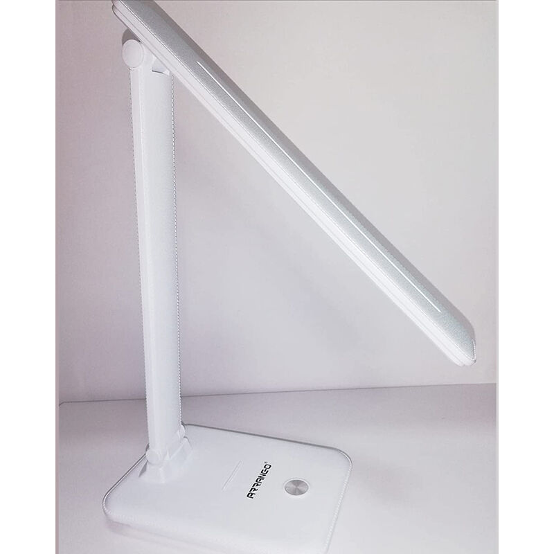 Comoda lampada da scrivania per illuminare i tuoi momenti di studio, lettura o altro. Struttura flessibile e regolabile che ti permette di adeguarla alle tue esigenze senza alcun problema. Grazie al comodo pulsante touch potrai scegliere tra 3 diverse tonalità di luce (bianca, gialla e bianca e gialla). Tenendo premuto il pulsante touch, inoltre, puoi regolare la tonalità della luce. Nessuno strobo, niente radiazioni, niente accecamento, niente di nocivo per gli occhi. La lampada da scrivania è dotata di una interfaccia USB che ti permette di ricaricarla comodamente ed in poco tempo da qualsiasi dispositivo. Moderno ed elegante in pelle di colore bianco. Accessorio ideale per aggiungere un tocco di raffinatezza alla tua scrivania o tavolo. Funzionalità - Tecnologia LED - Pieghevole fino a 180° - Ricaricabile - Anti-riflesso - 3 tipologie di luci regolabili - Porta USB per ricarica Specifiche - Temperatura del colore: 30006500K - Intensità luce Ra>80 - Tensione di funzionamento 5V