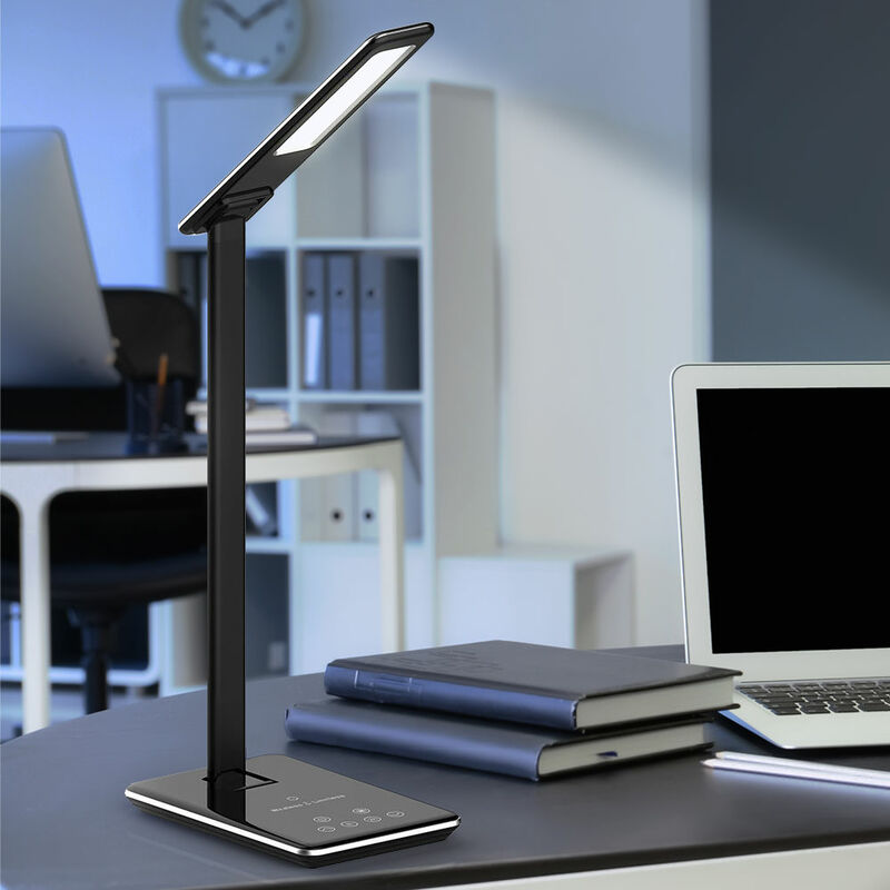 Descrizione Questa lampada da tavolo a LED convince per le sue numerose funzioni diverse e per il suo design moderno. La lampada è realizzata in alluminio nero e plastica e, grazie al suo design sofisticato, può essere ripiegata in modo molto piatto, in modo che sia ideale non solo per la scrivania di casa, ma anche per viaggiare. Il clou di questa lampada è la funzione di ricarica wireless (caricatore wireless) con la quale puoi, ad esempio, caricare il tuo cellulare (se questa funzione è supportata dal tuo dispositivo). Oltre alla funzione di ricarica wireless, la lampada da tavolo dispone di un'interfaccia per la ricarica dei dispositivi tramite USB. Con questa lampada da tavolo, puoi utilizzare l'interruttore a sfioramento per scegliere tra bianco caldo e bianco freddo (3000-6400 Kelvin) e attenuare i colori della luce. Inoltre, la lampada ha una funzione timer che spegne automaticamente la luce. Nella fornitura è inclusa una lampadina LED di alta qualità a risparmio energetico.