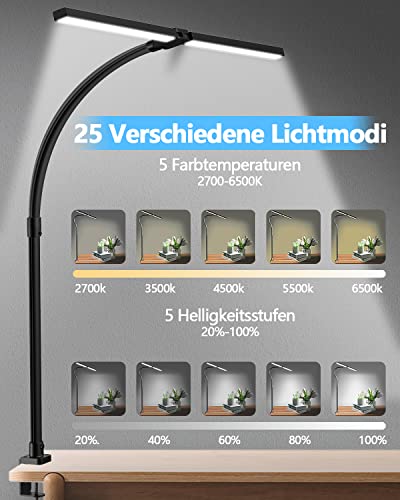 Lampada da Scrivania a LED con Morsetto, 24W 80 CM Doppia Testa Lampada da Tavolo LED, Lampade da Tavolo Lampada Monitor Lampada Ufficio Scrivania Con 5 Tipi di Luminosità e Temperatura Del Colore