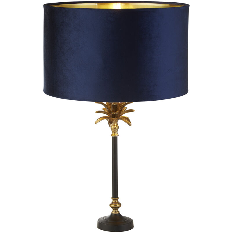 Collezione Palma LAMPADA IDEALE La lampada da tavolo Palm fonde perfettamente stile e funzionalità, armonizzandosi con interni sia tradizionali che contemporanei. Realizzato con materiali di alta qualità, vanta una base nera opaca e ottone anticato a forma di palma, sormontata da un lussuoso e ricco paralume in velluto blu scuro con un interno metallico dorato, infondendo eleganza e raffinatezza in qualsiasi zona giorno o camera da letto. La combinazione di colori caldi crea un punto focale accattivante per ogni stanza.