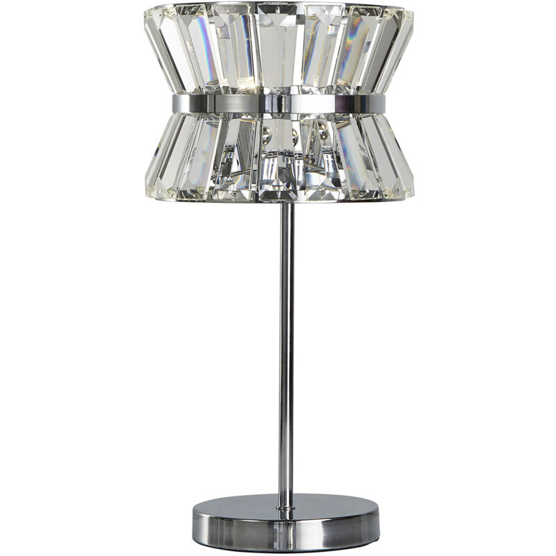 Collezione I Quartieri Alti IL CRISTALLO CHE TI MIGLIORA La lampada da tavolo a 2 luci Uptown è un sofisticato apparecchio di illuminazione perfetto per qualsiasi soggiorno, camera da letto o corridoio. Realizzato in elegante acciaio dolce con una splendida finitura cromata, si abbina facilmente a interni moderni e sofisticati. La sua forma ovale e una clessidra decorata con creste e la funzione di inclinazione di 6 gradi creano un effetto luminoso affascinante che aggiunge un tocco di eleganza a qualsiasi spazio. Con il suo design elegante e la funzionalità versatile, questa è un'aggiunta indispensabile per elevare uno spazio.