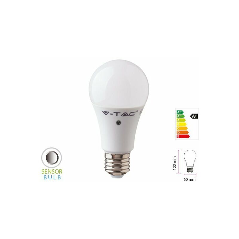 Lampada Led Attacco E27 Con Sensore Crepuscolare A60 Forma Sfera Bulbo Standard 220V 9W=60W 806lm Bianco Caldo 2700K Angolo 200 Gradi, Diametro 60mm Altezza 122mm Si Accende Automatico Quando Diventa Buio Marca V-TAC Codice Prodotto LC2729C Attacco E27 A60 Dimmerabile NO Sensore Si,Sensore Crepuscolare Voltaggio AC220-240V Potenza 9W Luminosità 806 Lumen CRI RA>80 Angolo Luce 200 Gradi Colore Bianco Caldo 2700K Impermeabilità IP20 Misura Diametro 60mm, Lunghezza Totale 122mm Durata > 30000 ore Omologazione SI, CE e RoHS Nota Bene Con Sensore Crepuscolare