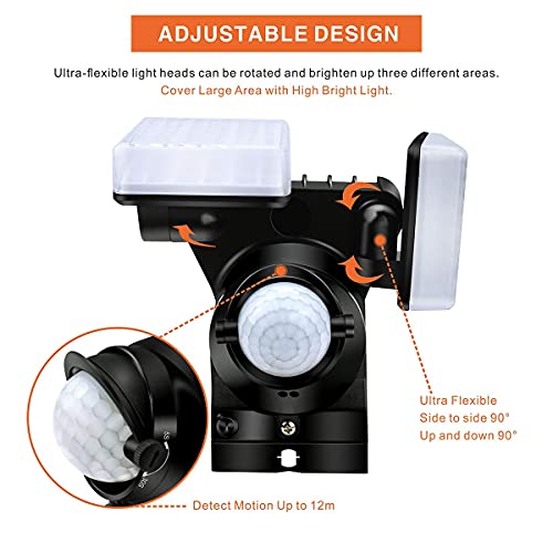 Il sensore ha un angolo di rilevamento a 180° e una distanza di rilevamento da 12 metri al massimo, e le testine di lampada sono rotabili sia verticalmente che orizzontalmente a 90°, si illumina in un'area di 150 metri quadrati con una grande luminosità.