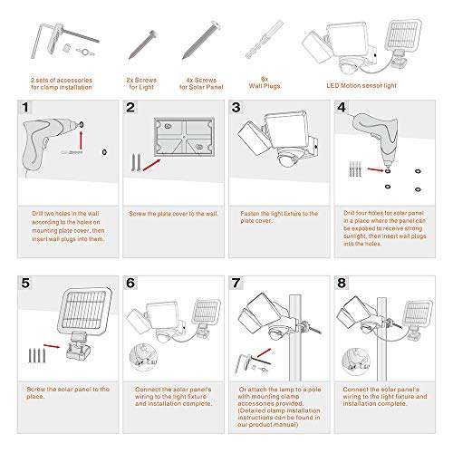 Montaggio a parete e installazione del Morsetto. Puoi montare facilmente la luce a LED del sensore di movimento solare sulla parete o altra superficie non piatta con viti e apparecchio di fissaggio inclusi, senza il cablaggio necessario. Pertanto, non ti serve assumere un elettricista.