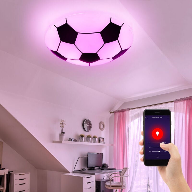 Descrizione LEMMI fa battere i cuori del calcio! Questo pallone da calcio luminoso porta gioia al vivaio. Ma non solo i bambini amano questo sport con la palla, che come hobby numero 1 semplicemente ispira tutti, e quindi la plafoniera (Ø 25cm) con vetro bianco e nero può sicuramente trovare posto in altre stanze come un gesto divertente, perché è pratico soddisfa sicuramente lo scopo di fornire all'ambiente una luminosità adeguata! Rispetto ai normali apparecchi di illuminazione, i faretti a LED consumano una quantità minima Quota di elettricità e consumano addirittura meno delle lampade a risparmio energetico. Questo protegge l'ambiente e il tuo portafoglio. Grazie alla sorgente luminosa inclusa, puoi comodamente utilizzare la lampada dal divano utilizzando l'app o utilizzare il controllo vocale. Puoi utilizzare l'app per impostare il timer den con diversi giorni della settimana e orari, nonché diversi programmi di illuminazione . Il la fornitura include una lampada LED RGB di alta