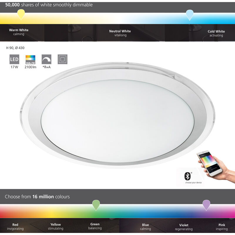 LAMPAGGIO LED LAMPO CROVALINK CONTRA-C White H: 9cm Ø: 43 cm Dimmabile 2700-6500K con funzione Connect Lampada a soffitto a LED a LED SMART con app e telecomando (escl.) Dimmabile, bianco regolabile di colore chiaro, bianco neutro, bianco freddo e colorato (RGB) Funzioni di app: timer, luce notturna, crepuscolo e simulazione della presenza e molto altro. Li> Il sistema di luminaire di Eglo Crosslink è compatibile al 100% con il sistema Eglo Connect e ti consente di controllare e programmare la luce nella tua casa individualmente. Basta connettersi tramite il telecomando Connect o l'app di controllo intelligente gratuito di Awox con le luci e controllarle singolarmente o in gruppo. Scegli tra uno spettro impressionante di 16 milioni di colori e 50.000 toni bianchi, la luminosità è gradualmente diminuita e crea il tuo ambiente perfetto per ogni momento! Vantaggi: Installazione rapida e facile: le lampade possono essere controllate direttamente con eglo collegare il telecomando o grazie