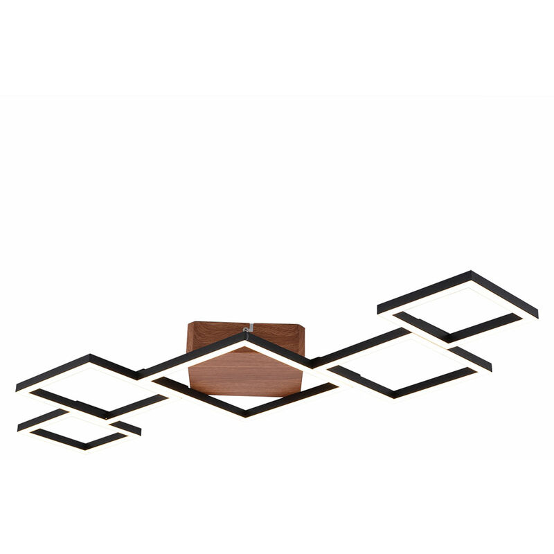 Descrizione Con il suo design elegante in metallo nero opaco e metallo con effetto legno, questa moderna plafoniera si inserisce meravigliosamente nell'atmosfera di un'ampia varietà di stili abitativi. La lampada da soffitto lunga 78 cm è composta da cinque telai metallici quadrati elegantemente allineati, con il telaio centrale fissato al parallelepipedo metallico con effetto legno che è il più grande e i telai esterni più piccoli. Inoltre, questi sono dotati di acrilico opalino, che copre le lampade a LED incluse. Con questi, la plafoniera fornisce 2000 lumen di luce con un piacevole colore della luce di 3000 Kelvin (bianco caldo). Con altri articoli della stessa serie completate il quadro generale dei vostri interni e mettete dei bei accenti. La lampada è inclusa nella consegna. Particolare lampada • Tipo di lampada: plafoniera • Materiale: metallo, plastica • Colore: nero opaco, effetto legno • Grado di protezione: IP20 • Classe di protezione: 2 • Lunghezza x larghezza x altezza