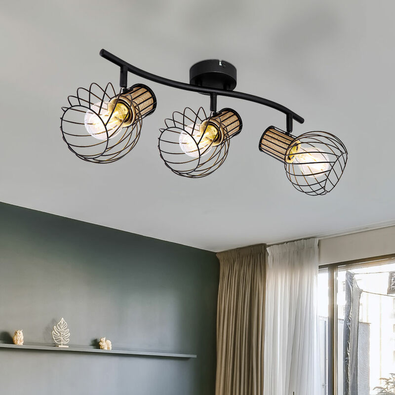 Descrizione Il faretto colpisce per la combinazione di elementi moderni e look retrò. L'articolo è in ottica nera e legno, i paralumi sono realizzati in rete metallica curva. La presa E27 integrata è progettata per un massimo di 40 W e consente sia lampadine dimmerabili che non dimmerabili, nonché la sostituzione della lampadina. Le lampadine non sono incluse! particolari • Tipo di lampada: plafoniera • Materiale: metallo, legno • Colore: nero, marrone • Schermi a griglia • punti in movimento • Grado di protezione: IP20 • Classe di protezione: 1 • Diametro paralume in cm: 12 • Lunghezza x larghezza x altezza in cm: 48 x 24 x 18,5 • Prese: 3x E27 • Lampadina inclusa: No • Potenza della lampada: 3x massimo 40 watt • Alimentazione: 230V, 50Hz