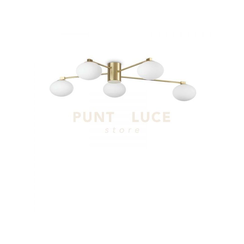 Lampadario a soffitto con base e montatura in metallo placcato. Diffusori in vetro incamiciato bianco, soffiato e acidato.