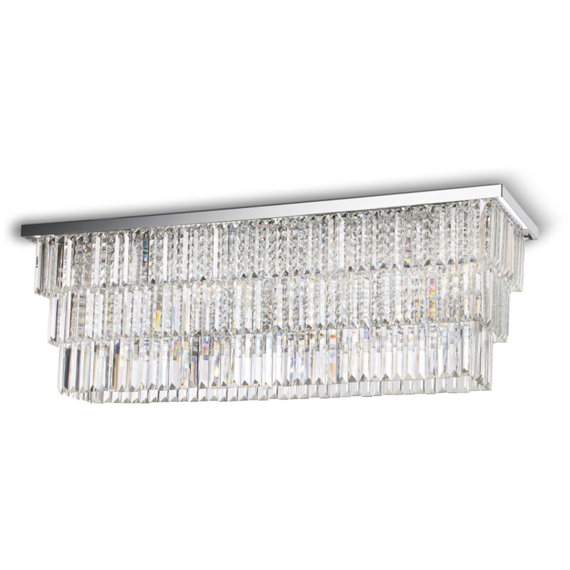 Collezione Martinez RAFFINATE E MAESTOSE Plafoniera a 6 luci con montatura in metallo dorato. Elementi decorativi con catene di ottagoni e barre in cristallo molato trasparente.