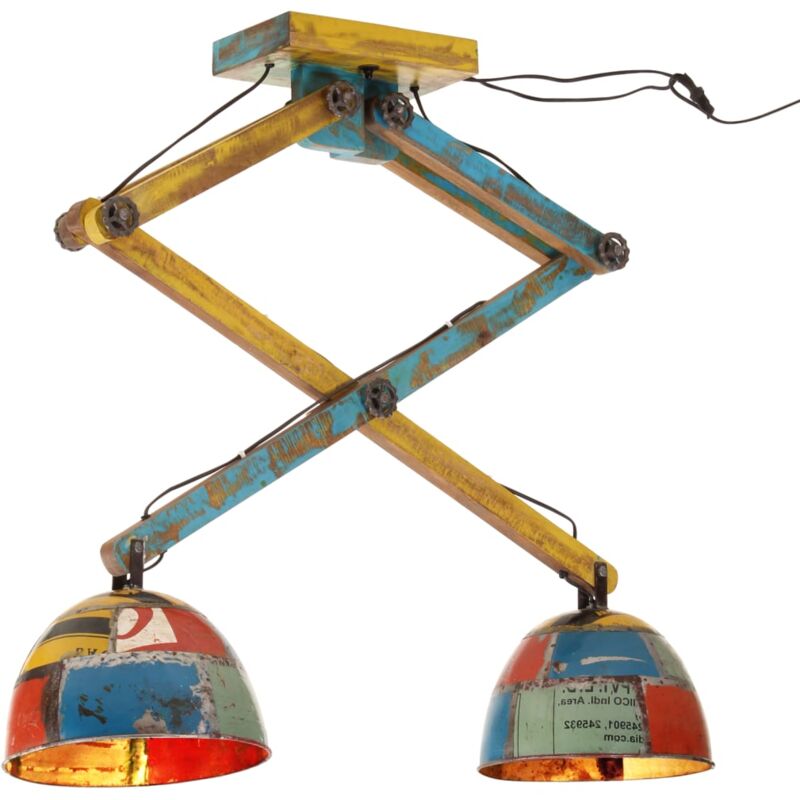 Questa lampada a soffitto mette decisamente in risalto il soggiorno, la sala da pranzo, l'ufficio, e così via. Robusto e stabile: Il legno massello di mango è un legno duro tropicale resistente, che dà vita a mobili robusti. Le belle venature del legno rendono ogni pezzo d'arredamento leggermente diverso dall'altro. Colore dipinto a mano: Siccome ogni pezzo è realizzato a mano, i colori unici variano a seconda di ciascun prodotto. Design con 2 paralumi: La lampada da soffitto, con 2 paralumi, è dotata di cinque prese E27 per lampadine con un massimo di 25 watt. Potete scegliere e installare lampadine E27 dai vari colori di luce, creando un'atmosfera di relax e riposo. Stile industriale: Il paralume in ferro, caratterizzato da una finitura di colori misti di recupero, si adatta perfettamente agli interni rurali o industriali. Buono a sapersi: Si tratta di una lampada in stile industriale con imperfezioni sul paralume, che dona identità alla lampada e la rende unica grazie al suo