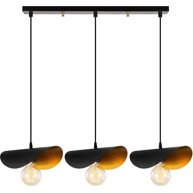 Lampada da soffitto Struttura in metallo Dimensioni: 80 x 17 cm Altezza: 106 cm Dimensioni paralume: 30 x 10 x 17 cm Dimensioni della base: 58 x 6 x 4 cm Lunghezza cavo: 90 cm Tipo di filo: 3 x E 27 Max 40 W IP20 Lampadina non inclusa Colore: nero Oro