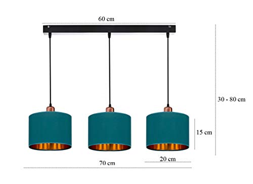 Dimensioni (cm): altezza = 30 - 80 cm, larghezza = 70, struttura: D = 60, paralume (cm): altezza = 15, larghezza = 20 colore: nero, blu scuro, verde, turchese. Materiale: metallo, attacco: tessuto: tipo: E27 3 x 60 W max, lampadina: non incluso, tensione: 230 V, montaggio: tassello, dimmerabile: sì, dimmer: non incluso