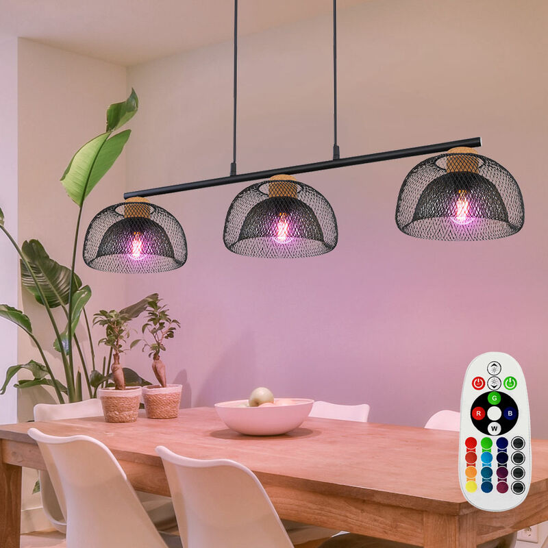 Descrizione Questa lampada a sospensione con paralumi in metallo nero è un punto culminante in ogni stanza. La lampada a 3 luci con una lunghezza totale di 68,5 cm è particolarmente adatta per l'illuminazione di tavoli da caffè e da pranzo. La materia prima naturale del sughero garantisce inoltre un ambiente accogliente e caldo. Utilizzando il telecomando in dotazione le lampade LED RGB in diversi colori e garantiscono così un'illuminazione d'atmosfera. La fornitura comprende tre lampadine LED RGB con telecomando per luce bianca e controllo RGB. Luce dettagli • Tipo di lampada: lampada a sospensione • Materiale: metallo, sughero• Colore: nero• Paralume: rete metallica • lunghezza x larghezza x altezza in cm: 68,5x20x150 • Attacco: 3x E14 • Lampadine incluse: Sì • Potenza lampadina: 3x 3,5 watt• Flusso luminoso: 4x 320 lumen• Colore luce: bianco caldo• Telecomando: Nu r per l'illuminante LED RGB • alimentazione: 230V, 50Hz Dettagli illuminante • Tipo di sorgente luminosa: LED RGB